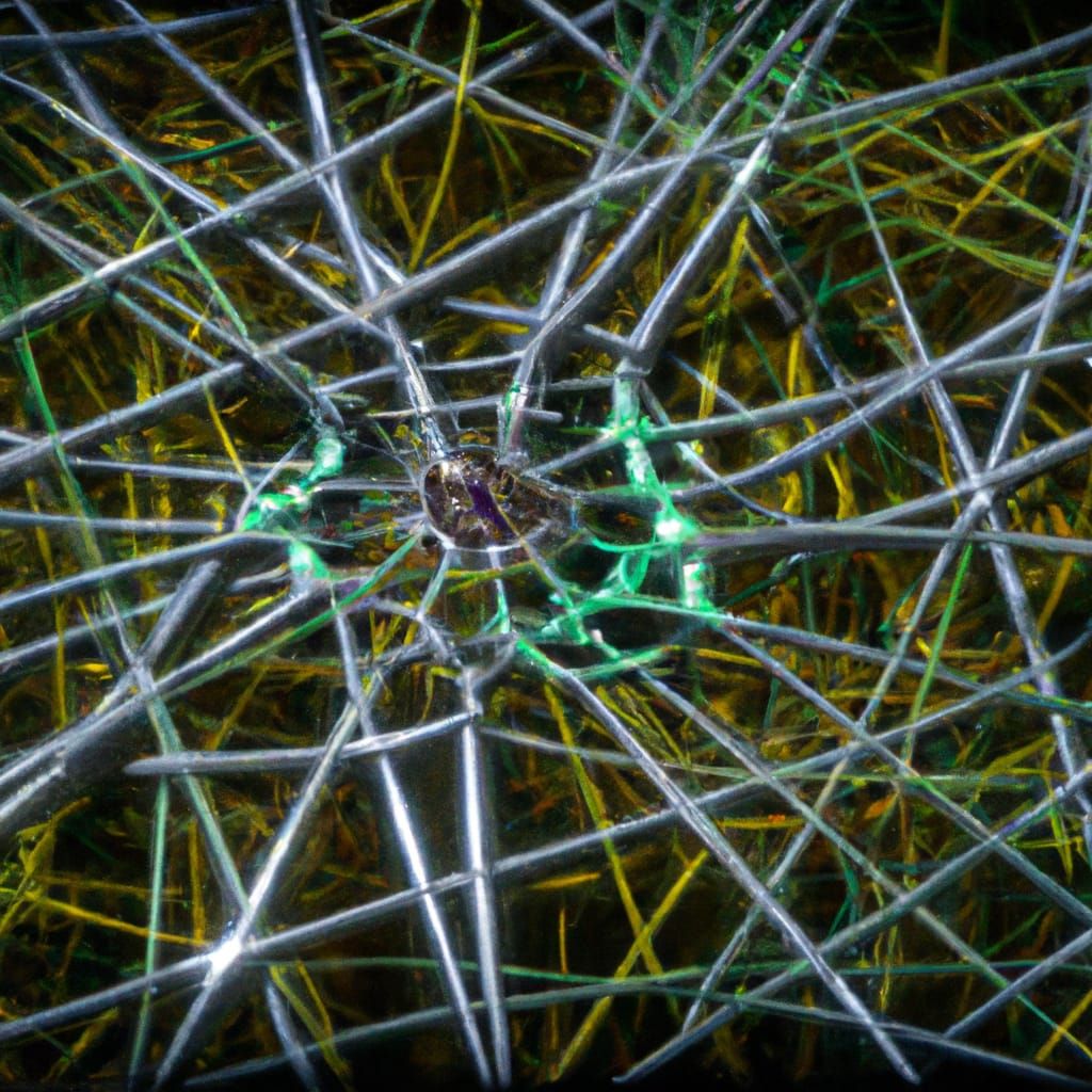 A photorealistic and highly detailed image of a surreal spiderweb made of razors and hooks. The detailed painting features a matte background and ethereal horror elements.