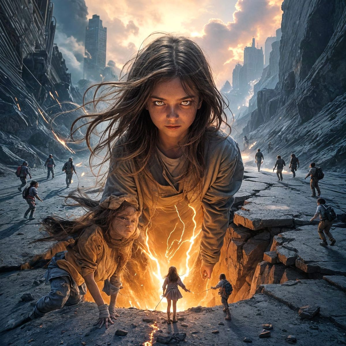 A little girl with dirty clothes with stains. She has very long brown hair. Her hair is flowing with the wind. Her eyes are magical. From her eyes comes a fire shining laser. The laser is directed towards one the asfalt. The asfalt is devided in two and creates a huge crack that has people falling down ...