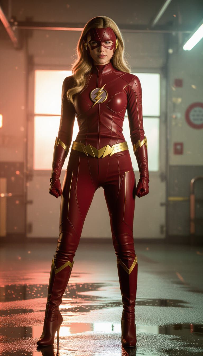 A stunning, ultra-realistic depiction of a powerful female Flash in a full-body shot. Captured with cinematic lighting and film grain, this image features vibrant scarlet and gold hues, conveying super-speed with dramatic flair.
