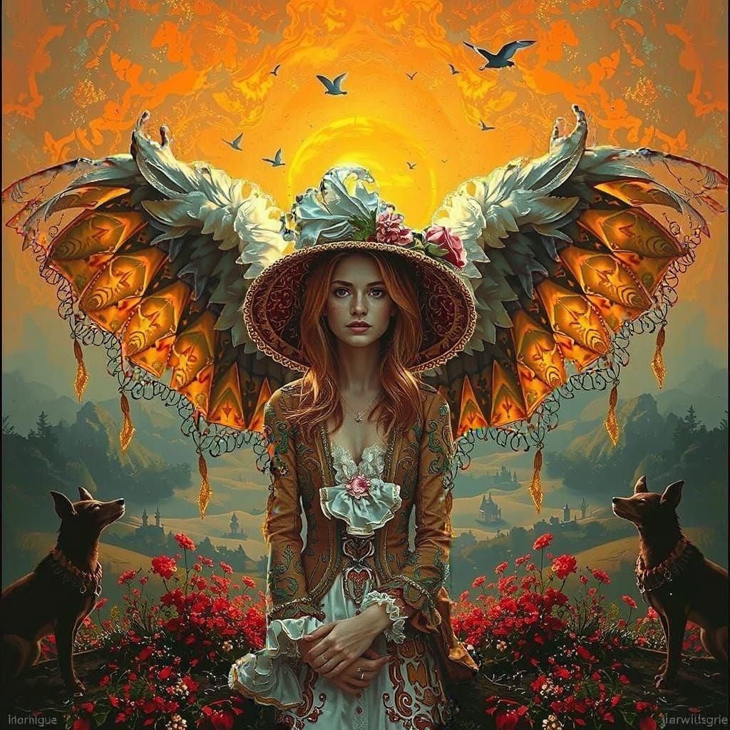 A figure in vintage clothing stands in a serene French countryside. Soft golden light and intricate details create a romantic and idyllic scene evoking the style of Rococo art.