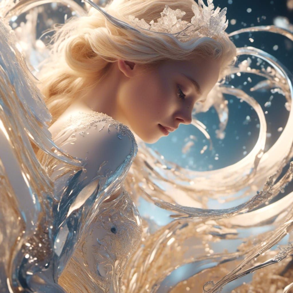 This image shows a photorealistic cinematic portrait of a woman with striking eyes. The scene features dramatic lighting, intricate details, and an organic, liquid platinum aesthetic.