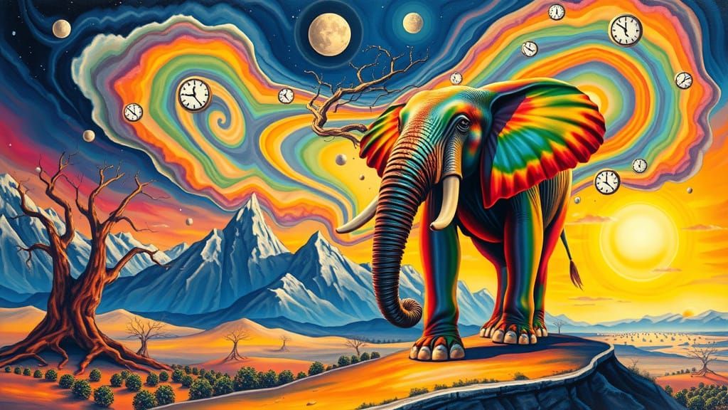 This image depicts a dreamlike scene with a massive, colorful tree and a surrealistic elephant in a vibrant, melting clock-inspired landscape. Swirling clouds and majestic mountains add to the sense of awe and wonder, creating a world that's both fantastical and thought-provoking.