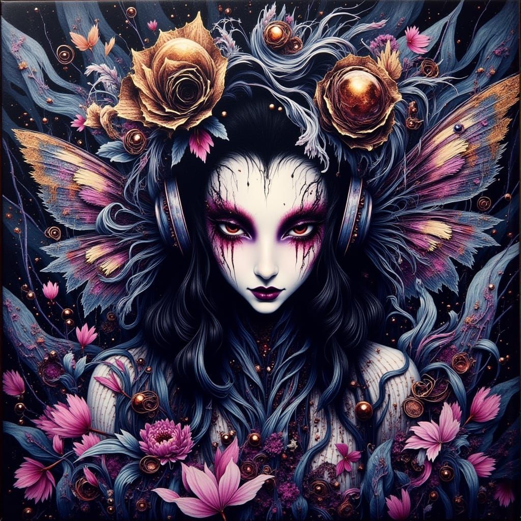 This image shows a beautiful fairy in a dark, twisted scene with silver, purple and gold details. Eldritch, horror-inspired zentangle patterns create a high-contrast, colorful scene reminiscent of 80s anime.