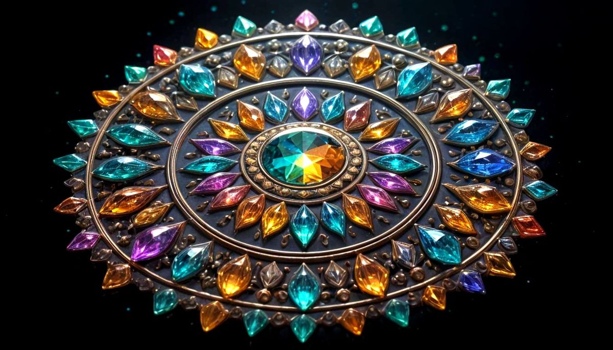 This image shows a geometric mandala of crystals and gemstones in symmetrical patterns. The deep black background enhances the vibrant colors of the radiant, intricate designs.