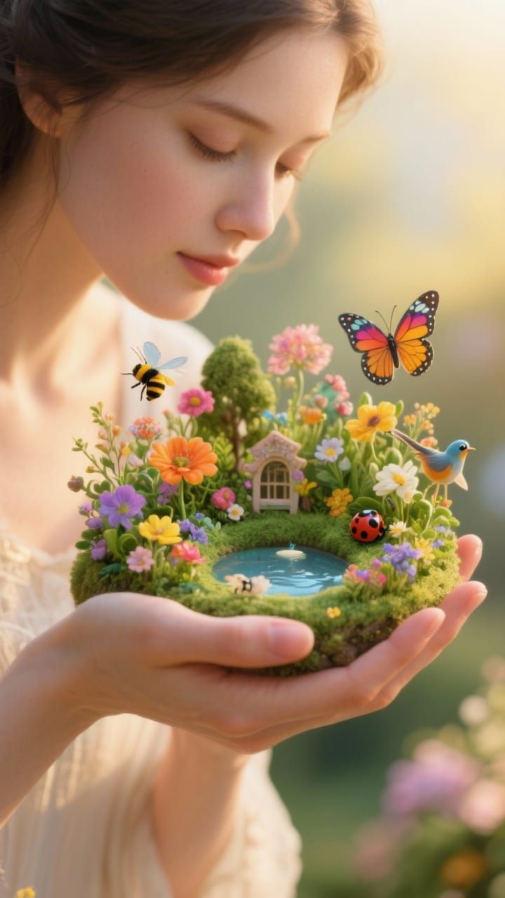 This hyperrealistic image shows a detailed miniature garden with flowers, a pond, and tiny wildlife like butterflies, bees, birds, and ladybugs, all held in a woman's palm with a soft bokeh background.