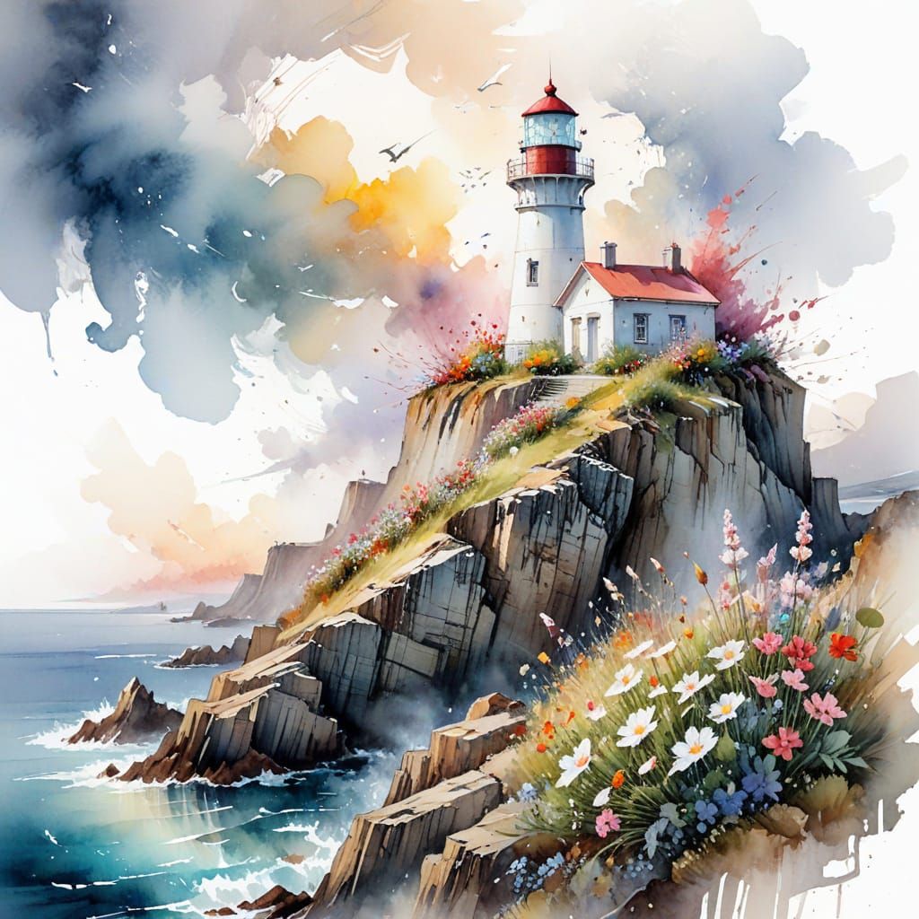 A watercolor illustration of a lighthouse on a flower-covered ocean cliff. The image blends expressive watercolor techniques and cinematic stylization within a chaotic yet beautiful scene.