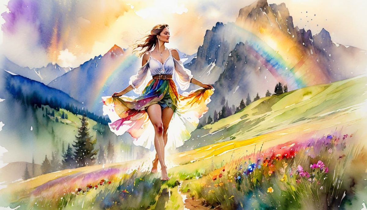 A watercolor of a woman in a sheer blouse walking barefoot through a rainy alpine meadow. Golden sunlight and a rainbow accent the warm triadic color palette.
