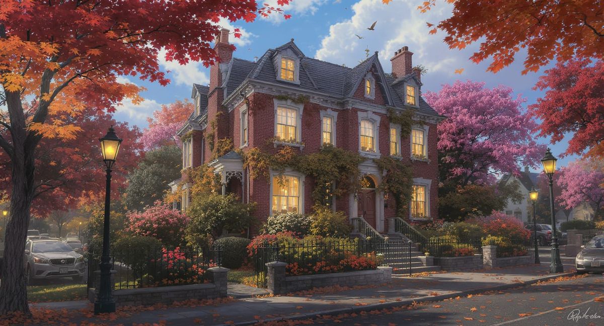 This digital painting captures a charming brick townhouse on a lively city street, bathed in warm lamplight amidst falling autumn leaves under a blue sky. Evokes a sense of cozy urban fantasy.