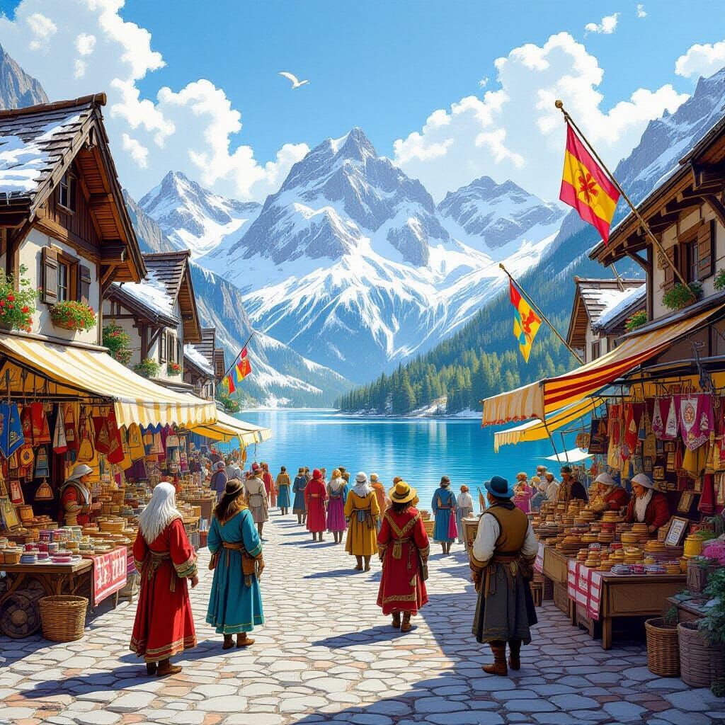 This image depicts a vibrant medieval marketplace by an alpine lake. Merchants in detailed clothing sell goods under fluttering banners, set against snow-capped mountains in the style of fantasy art.