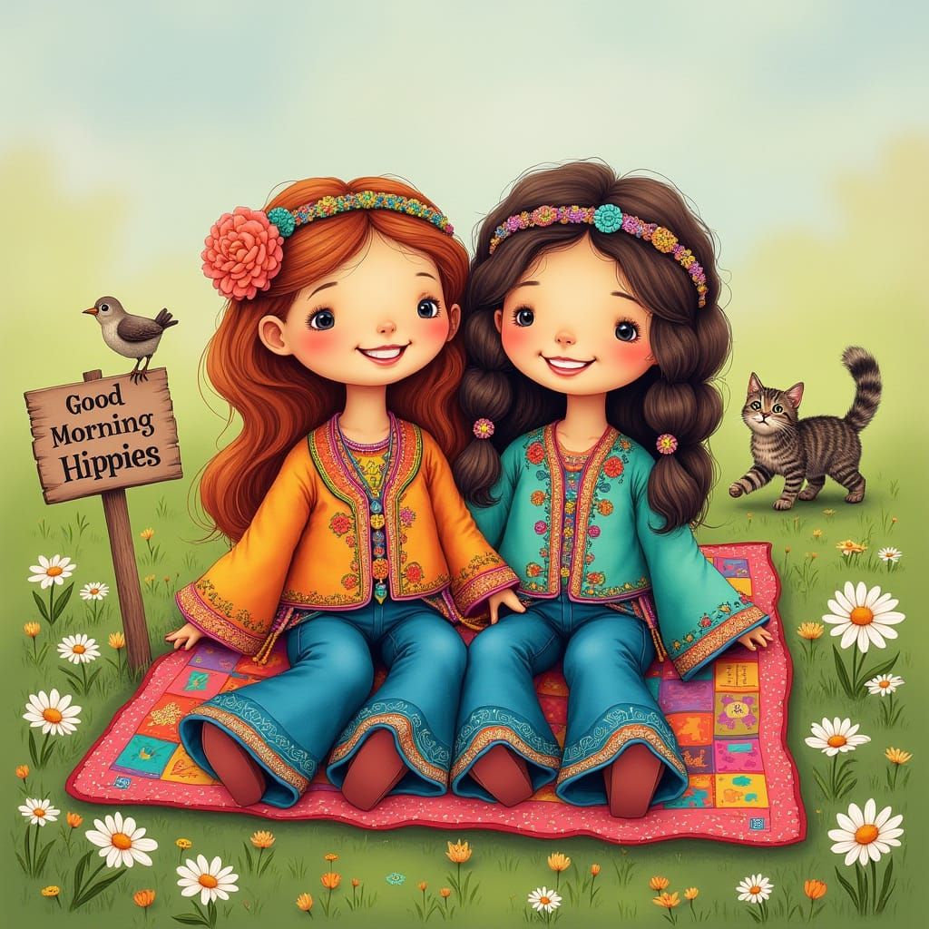 A vibrant image of two smiling hippie dolls on a quilt. The dolls wear embroidered tunics and bell-bottom jeans, accompanied by a cat and a sign reading "Good Morning Hippies" in a whimsical style.