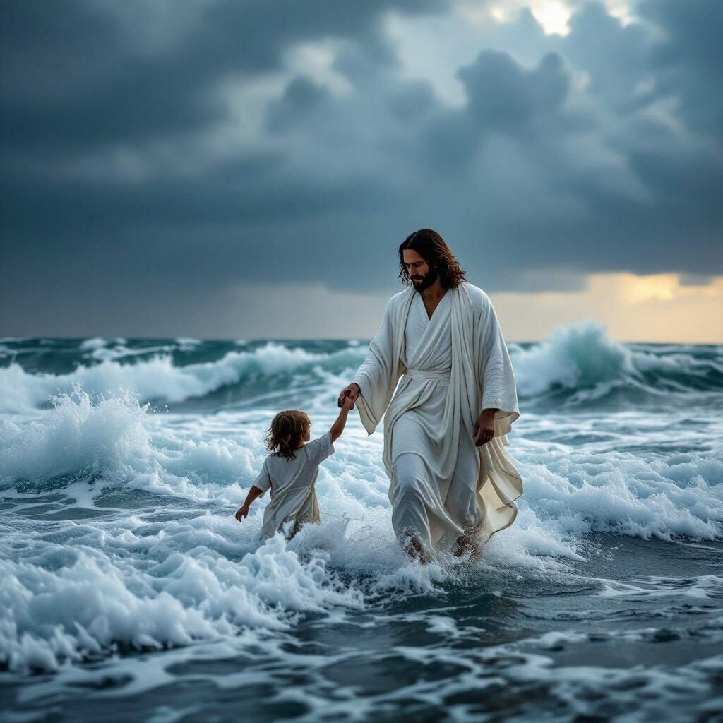 This image shows Jesus in white robes holding a child's hand, walking on a stormy sea. The cinematic shot features dramatic lighting, film grain and a subtle vignette, creating epic drama.