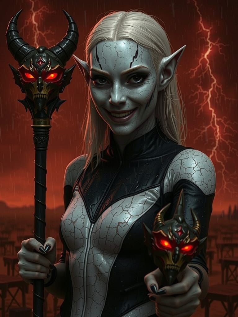 A hyper-realistic image of a demoness standing in a stormy desert, exuding evil intent with her sinister smirk and soulless eyes, set against a bleak red sky with lightning.