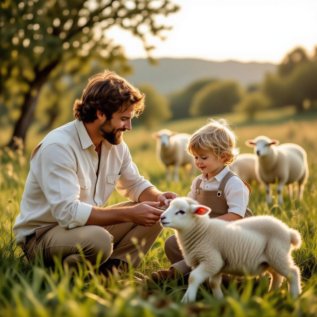 This image shows a father teaching his son how to care for sheep in a green field in the south of France. The artwork evokes early 20th-century rural life with a golden, late-day light, in a painterly style.