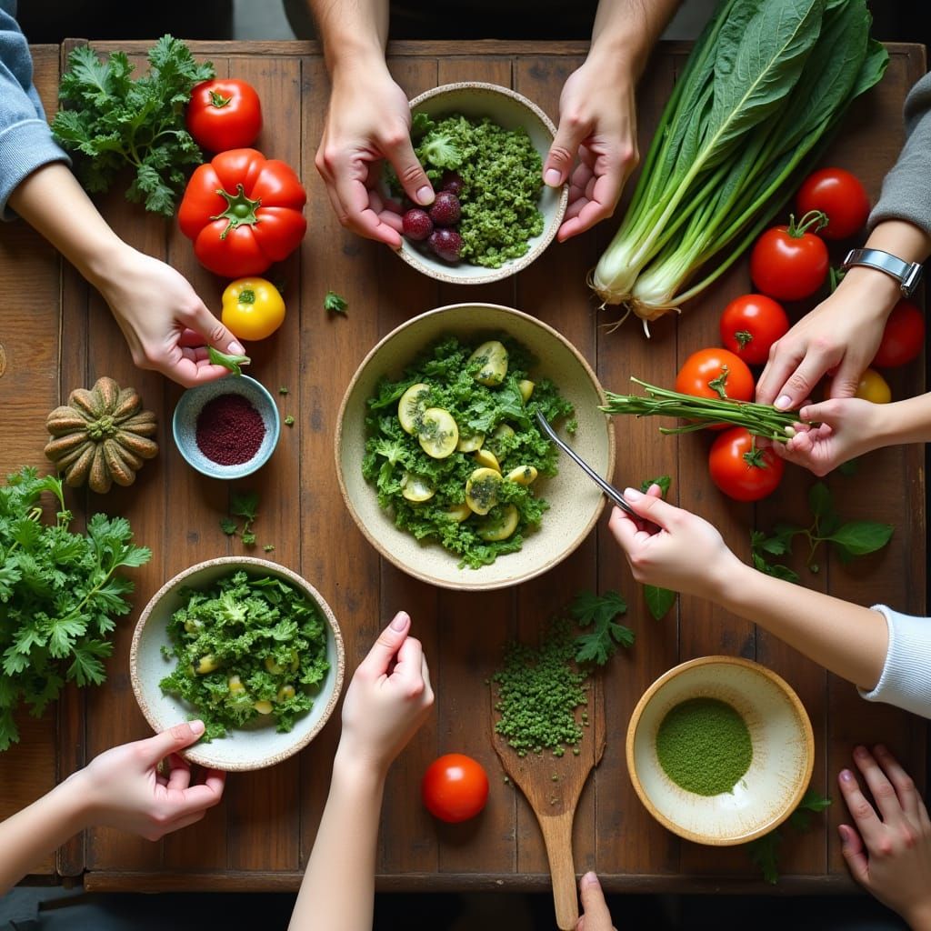 This image shows a warm and inviting scene of diverse hands preparing fresh produce and homemade salad bowls around a wooden kitchen table, surrounded by vibrant fruits and vegetables in a rustic setting with natural lighting, evoking a sense of earthy charm.