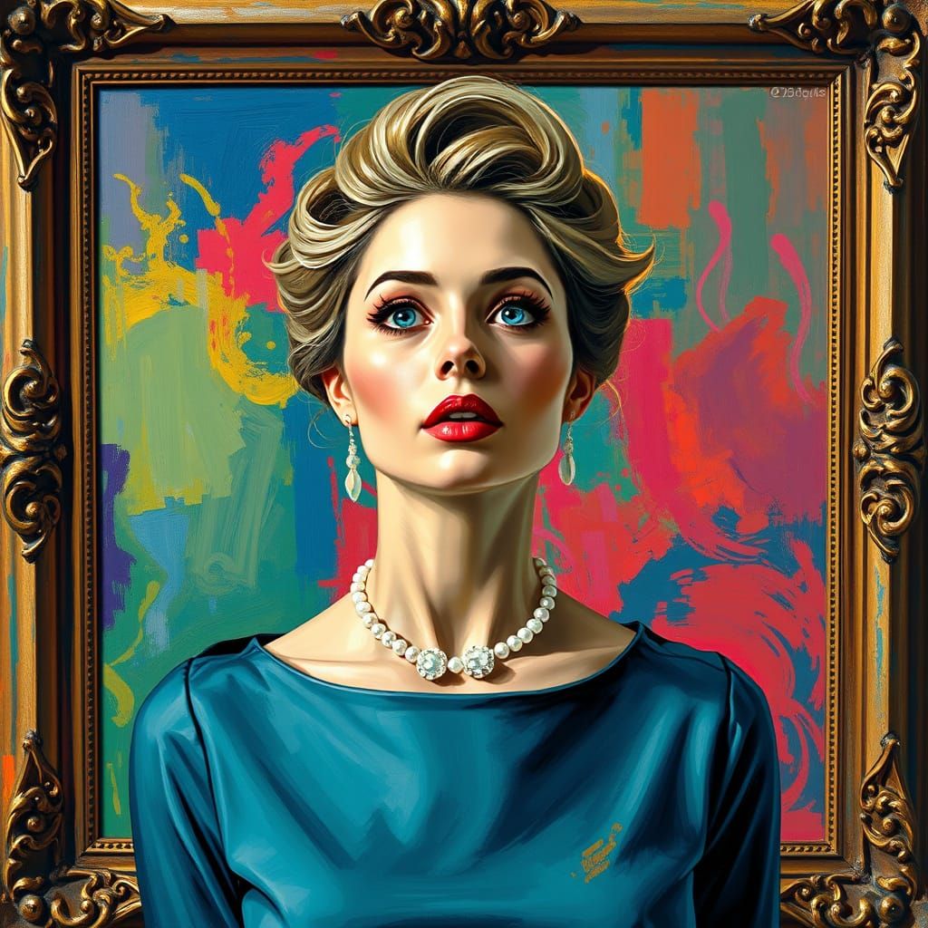 This image shows a woman in formal wear gazing at a colorful painting. The artwork features expressive brushstrokes and a vibrant palette, in a painterly style.