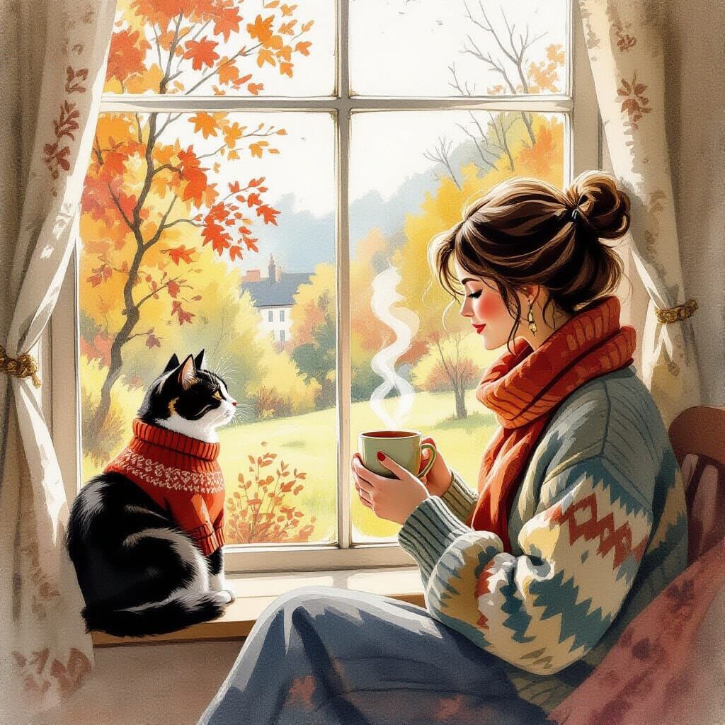 This image shows a woman holding a mug, seated by a window, facing a cat wearing a sweater. The scene is reminiscent of watercolor art with visible brush strokes.