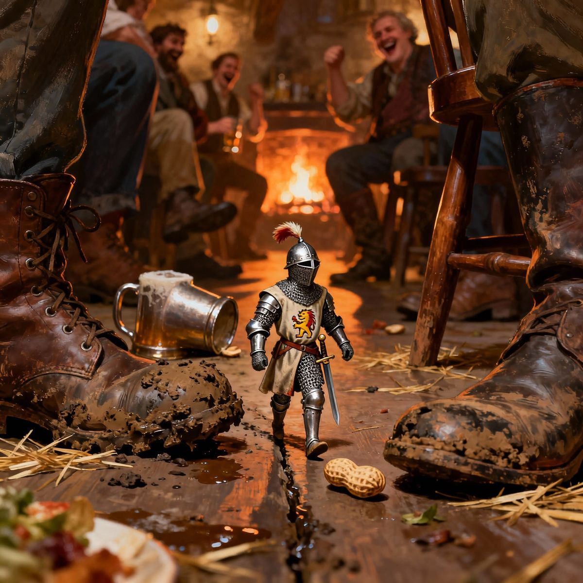 This fantasy painting shows a miniature knight bravely navigating a giant tavern. The art captures the overwhelming scale of massive boots and spilled ale from a low perspective.