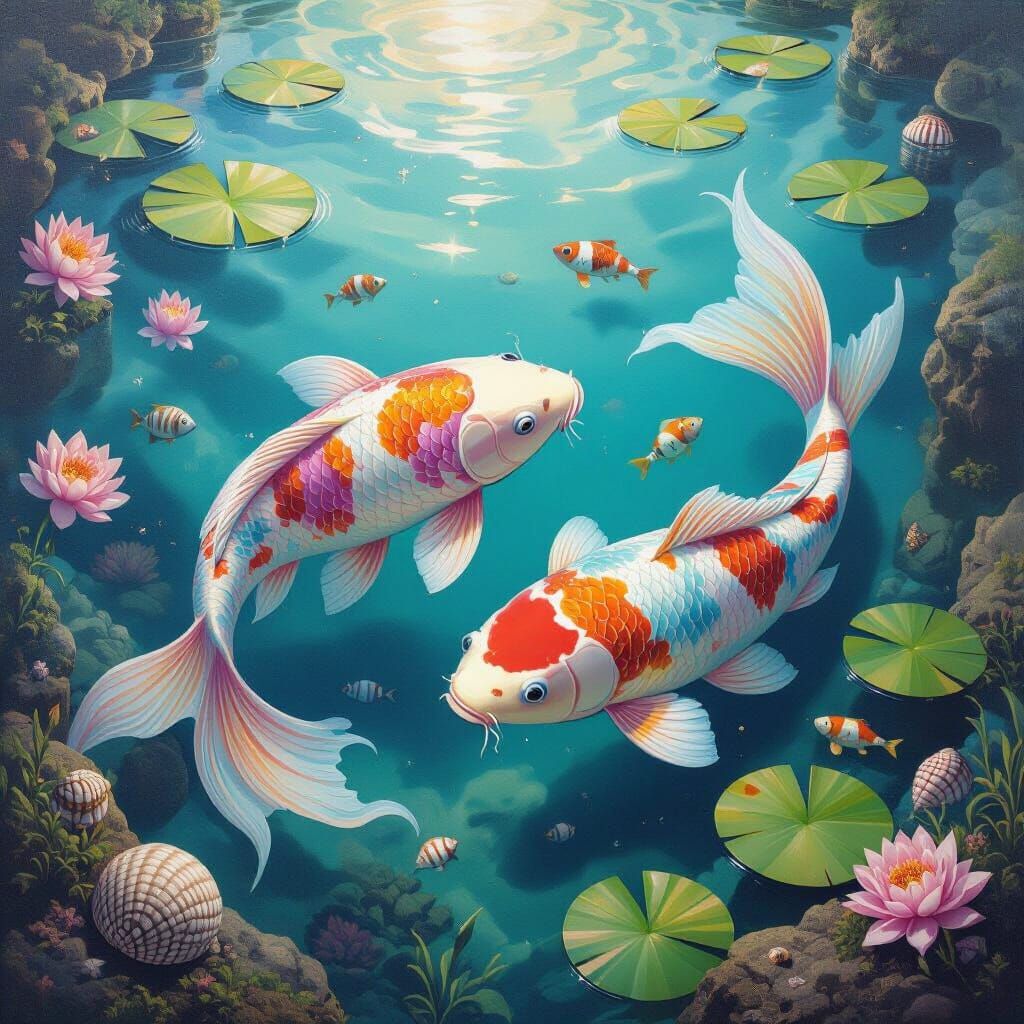 This image depicts a vibrant underwater scene with two large koi fish as the focal point. The fish are surrounded by lily pads, other marine life, rocks, and shells, rendered with a hazy, dreamlike quality in a surreal style.