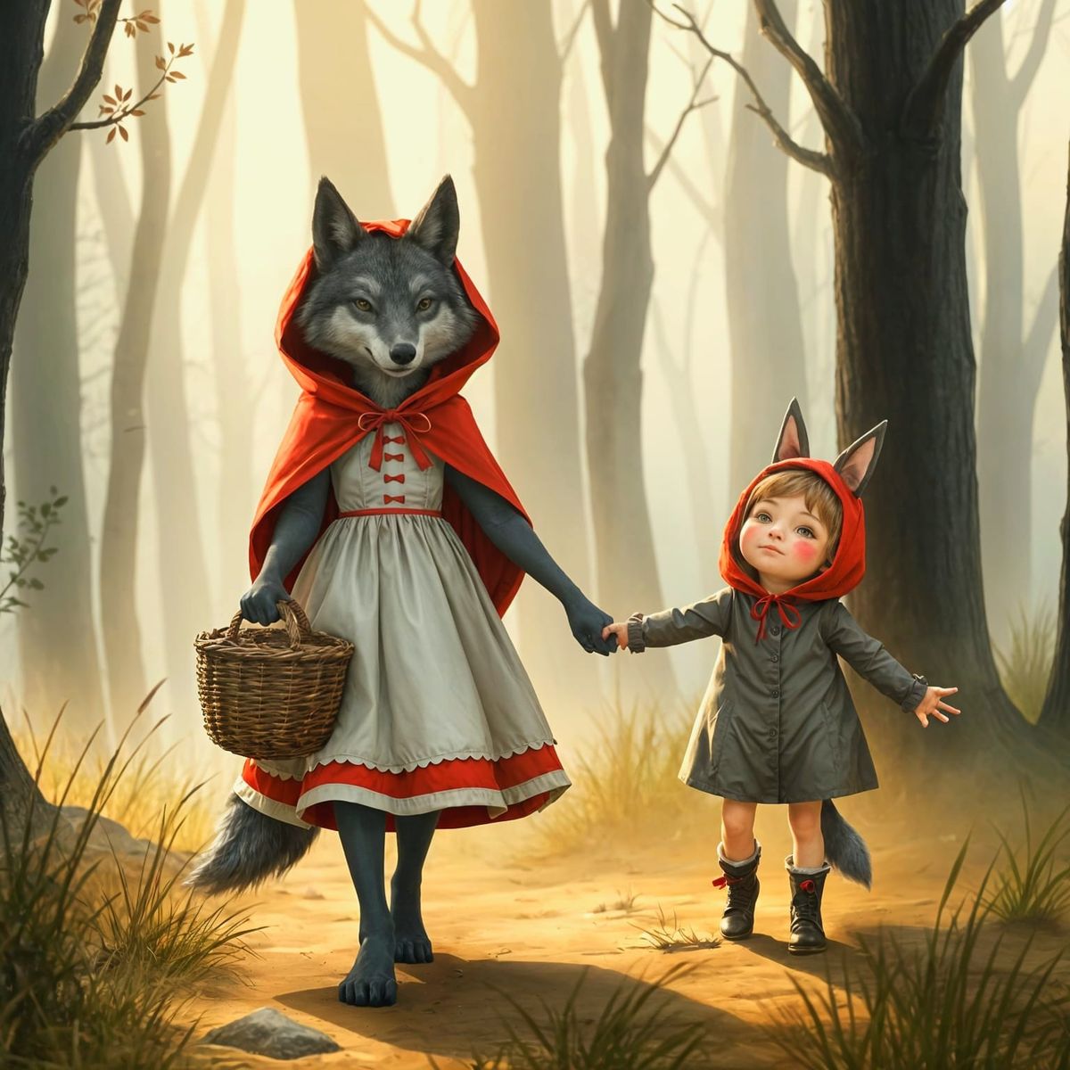 This enchanting image shows a wolf in Little Red Riding Hood's disguise walking alongside a girl dressed as a wolf, blending fantasy and folklore in a captivating scene