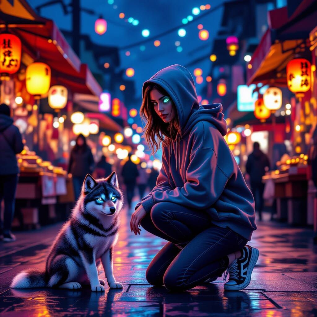 This image shows a girl in streetwear kneeling in a busy night market with a glowing-eyed wolf pup. Lanterns illuminate the scene with a warm glow, in a digital art style with cinematic lighting.