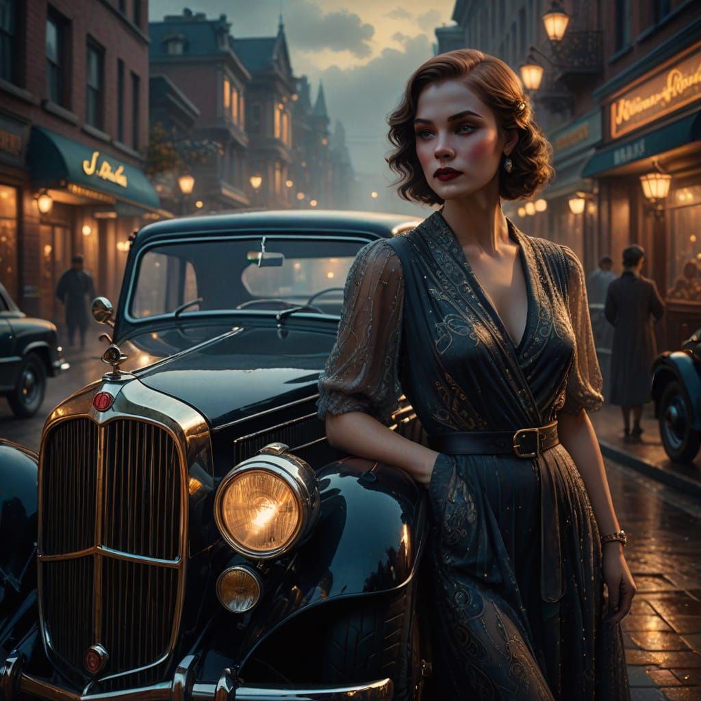 This image shows a beautiful woman posing with a classic car in a dark, ethereal art deco setting. The scene features golden lighting, soft mist, and mysterious shadows, rendered with vivid colors.