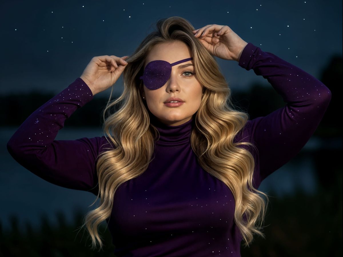 A glamorous and mystical night portrait featuring a woman in an aubergine glitter dress and eyepatch, posing in a garden with fireflies and lanterns, in a fine art photography style.