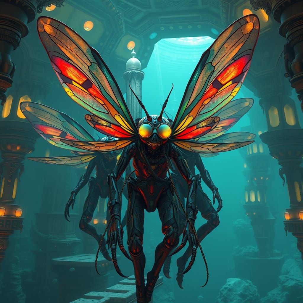 A surreal underwater city teeming with humanoid insect-like beings in elaborate diving suits. The scene features glowing bioluminescent lighting and art nouveau architecture.