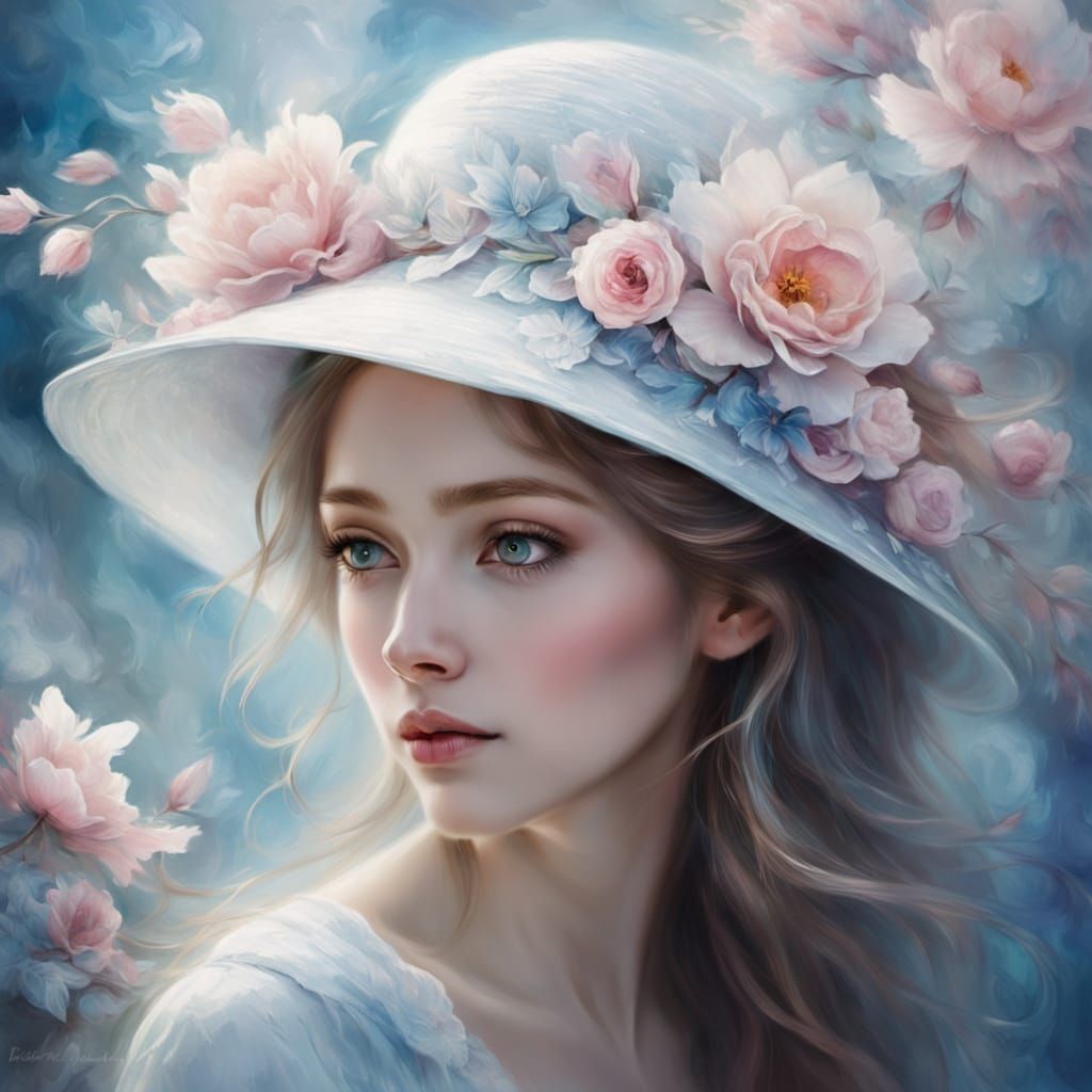 This impressionistic oil painting features a young girl with flowing hair, wearing a textured hat adorned with flowers. Soft brushstrokes and luminous pastel colors create a dreamy, atmospheric scene.