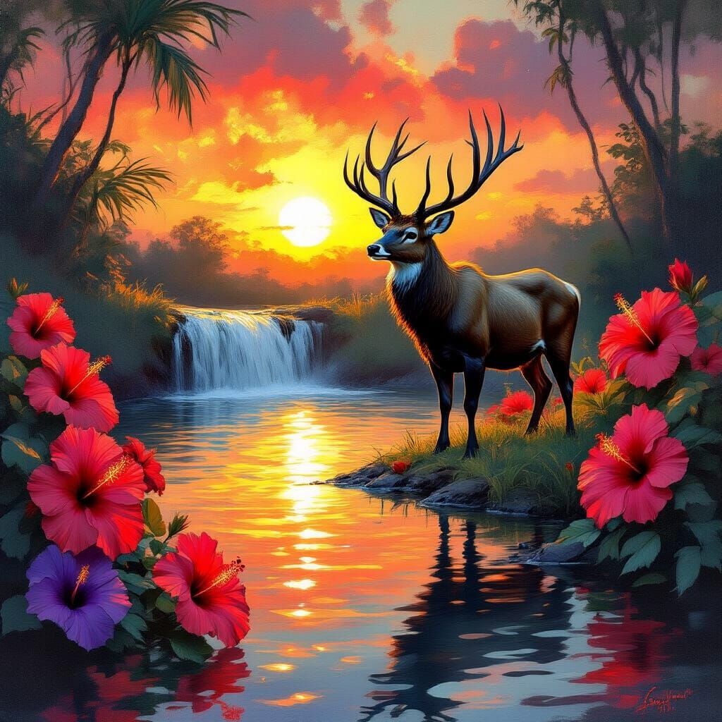 This image shows a majestic buck standing at the edge of a pond, bathed in the light of a setting sun. The scene is rendered with expressive brushstrokes and an ethereal quality reminiscent of classical paintings.