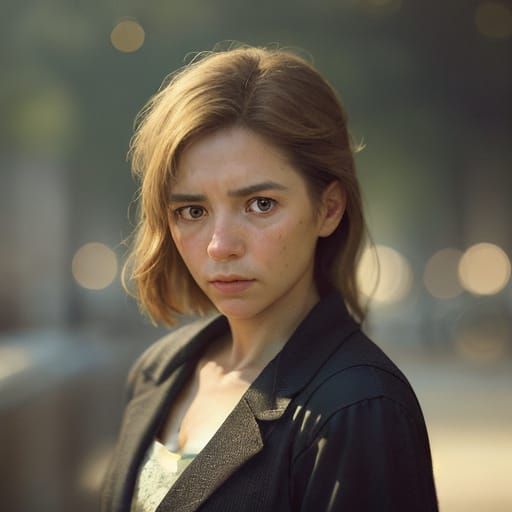 This poignant film still captures a young woman's introspective moment, bathed in soft, golden light with a warm, nostalgic atmosphere and neo-impressionist colors, reminiscent of classic 35mm film aesthetic.