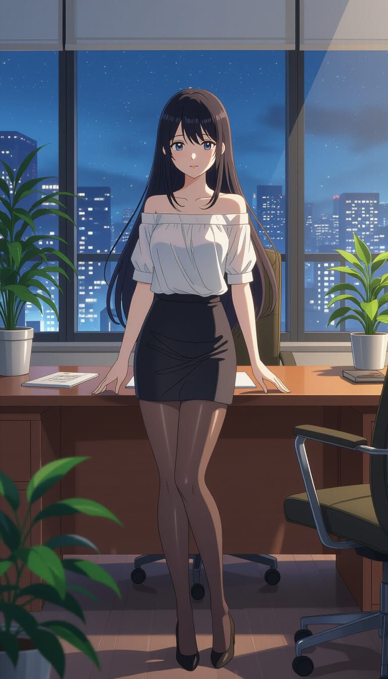 This image shows a shy, young female secretary in an anime style, standing next to a modern CEO's desk at night. She is wearing elegant attire, with a night city skyline visible through the window, softly rendered.