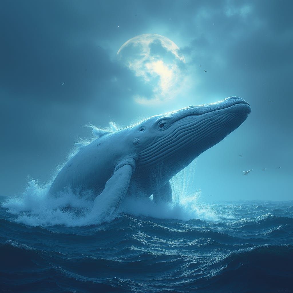 This enchanting image captures a majestic ocean white whale breaching the surface, surrounded by a mesmerizing display of shimmering savannah lights, evoking a dreamy and otherworldly atmosphere.