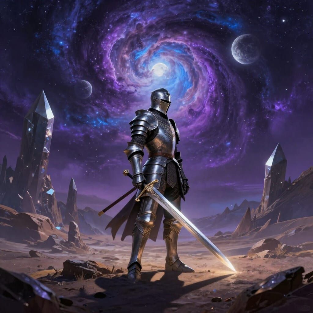 This hyper-realistic digital painting shows a knight on a desolate alien world under a swirling nebula sky. Dramatic lighting highlights crystalline formations and immense scale.