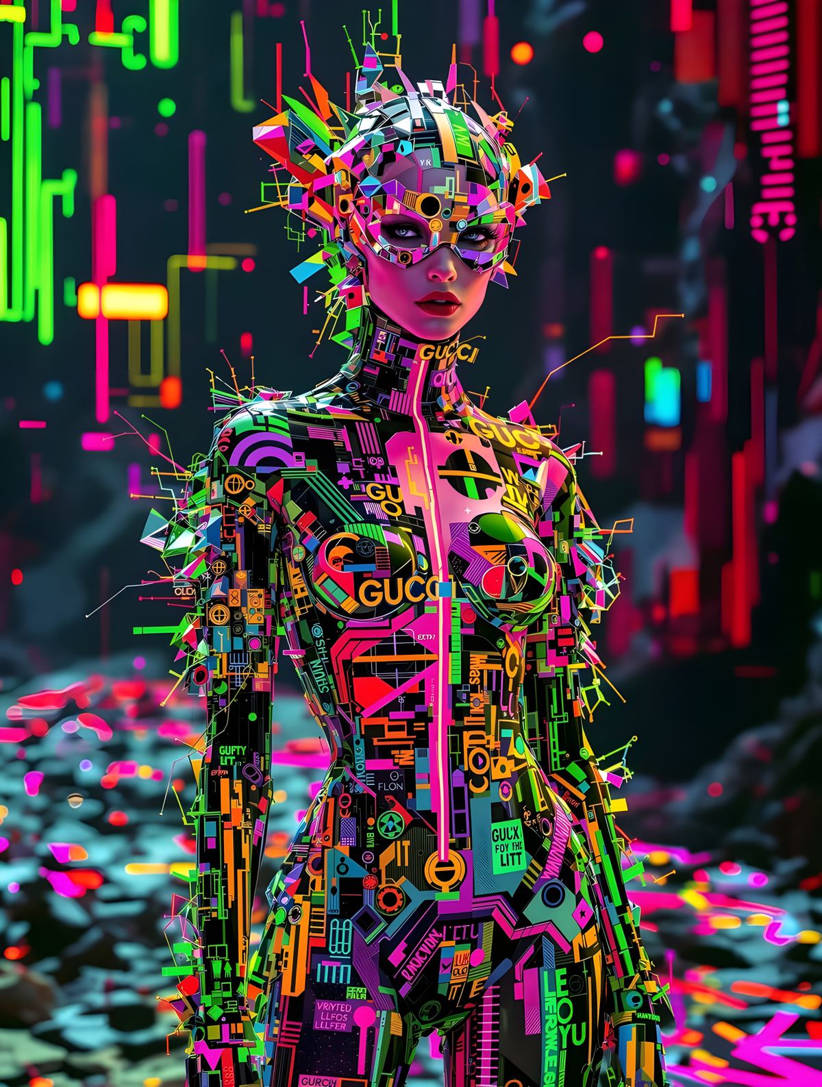 This hyperrealistic image features a model in a striking op-art bodysuit, with fragmented features and glitch effects. Neon colors and dark futurist elements create an unsettling, high-definition scene.