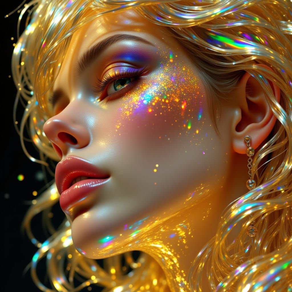 A stunning portrait of a woman crafted from shimmering glass, adorned with rich gold details. This fantasy image evokes a dreamy, iridescent aesthetic with intricate textures.
