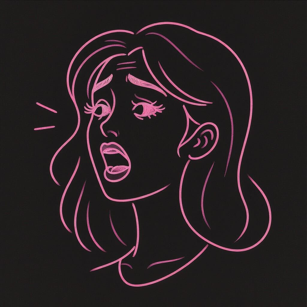 This image shows a cute, simple cartoon drawing of a woman's profile. Created with a single continuous pink line on a black background, she has a confused, screaming expression. The artwork emphasizes bold linework and dynamic contouring.