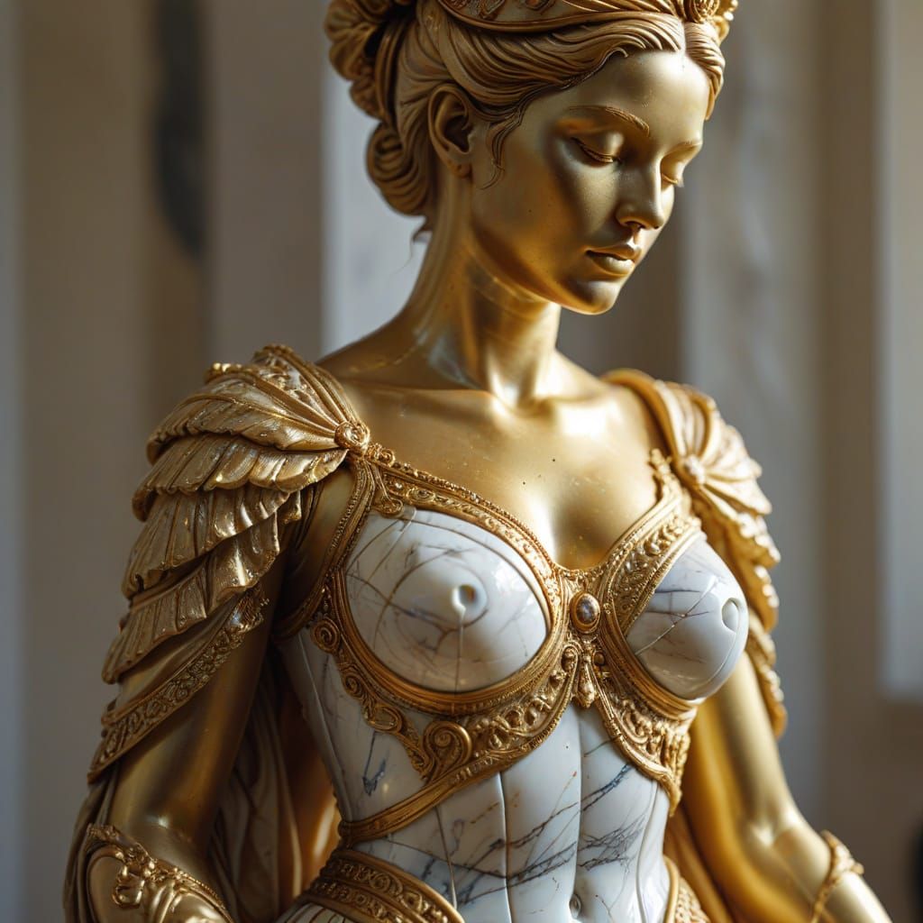 This image shows a sculptor meticulously carving a marble statue of an elegantly dressed woman. The hyper-realistic digital art features intricate details, soft textures, and warm, natural lighting.