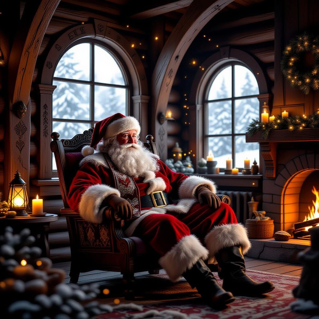 A cinematic fantasy image of Santa Claus relaxing in an ancient Nordic cabin. Blending dark elegance with cozy charm, the scene features glowing lanterns, magical realism, and intricate textures.