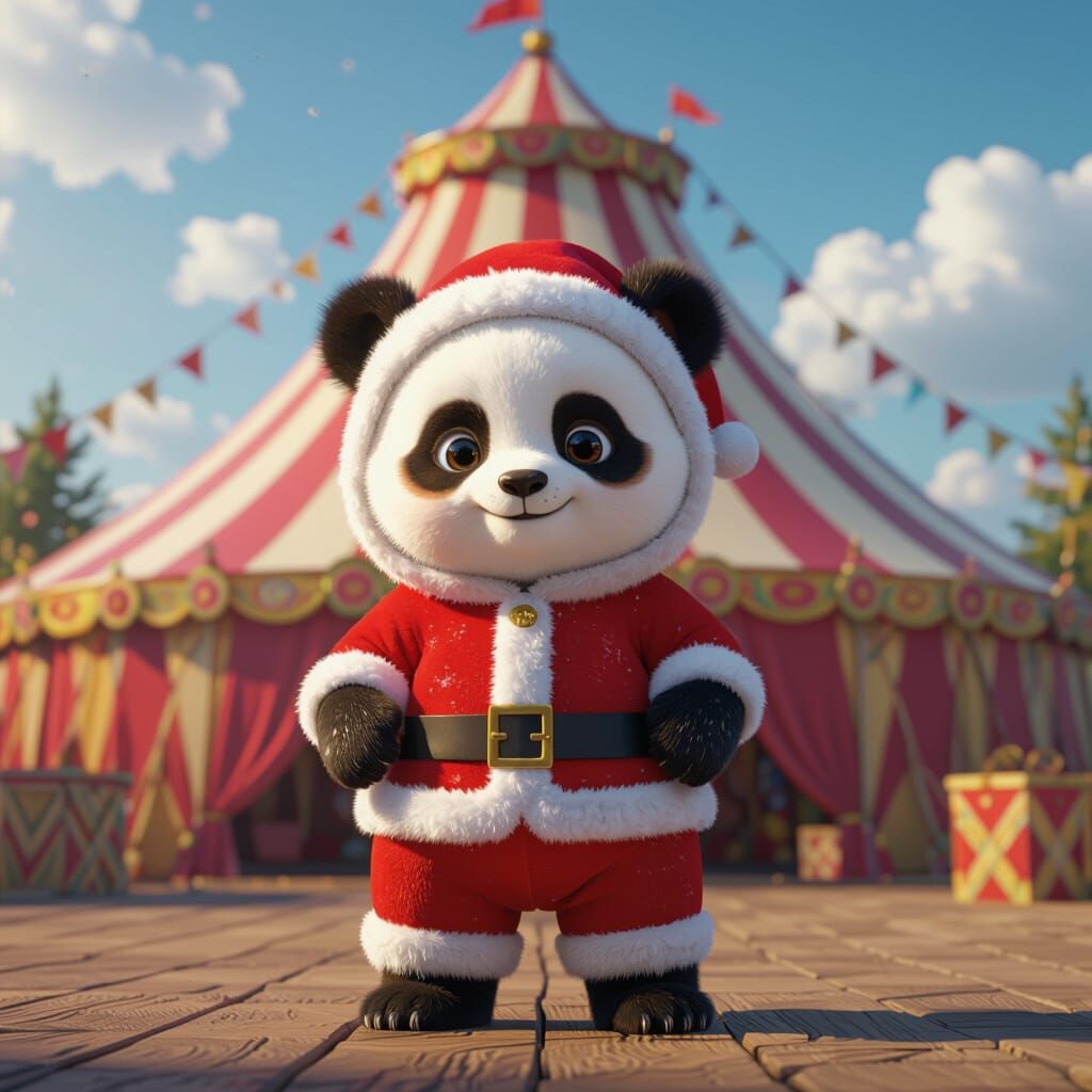This image shows a charming baby panda in a Santa outfit, posing before a grand circus tent. Rendered in a detailed 3D anime style with photorealistic lighting.
