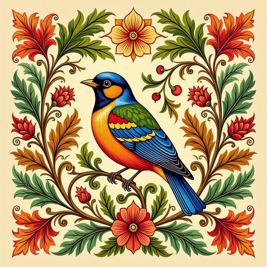 Design your own colorful bird and oak leaf illustrations in William Morris style. Free and easy AI image generation.