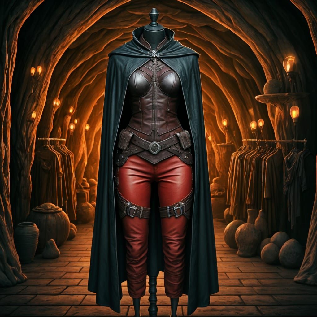 This image shows a mannequin displaying a Drow explorer's outfit. The outfit includes coral-red leather pants, a back-armored blouse, a utility cloak, and ornamental dagger holsters, set in a cavern outfitter's shop.