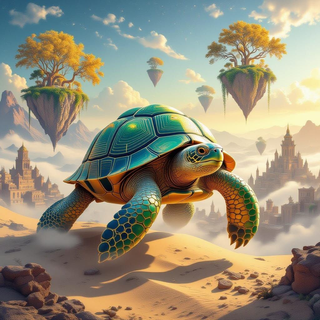 Гигантска костенурка, чиято коруба да е зелена със сребристи и златисти нюанси, които да искрят. Да се носи над древен град наполовина скрит в пясъци. В далечината въздушни острови от зеленина и красиви дървета със златни и сребристи листа. Да е мистично и вълшебно да е ранна утрин и да има лека мъгла. ...