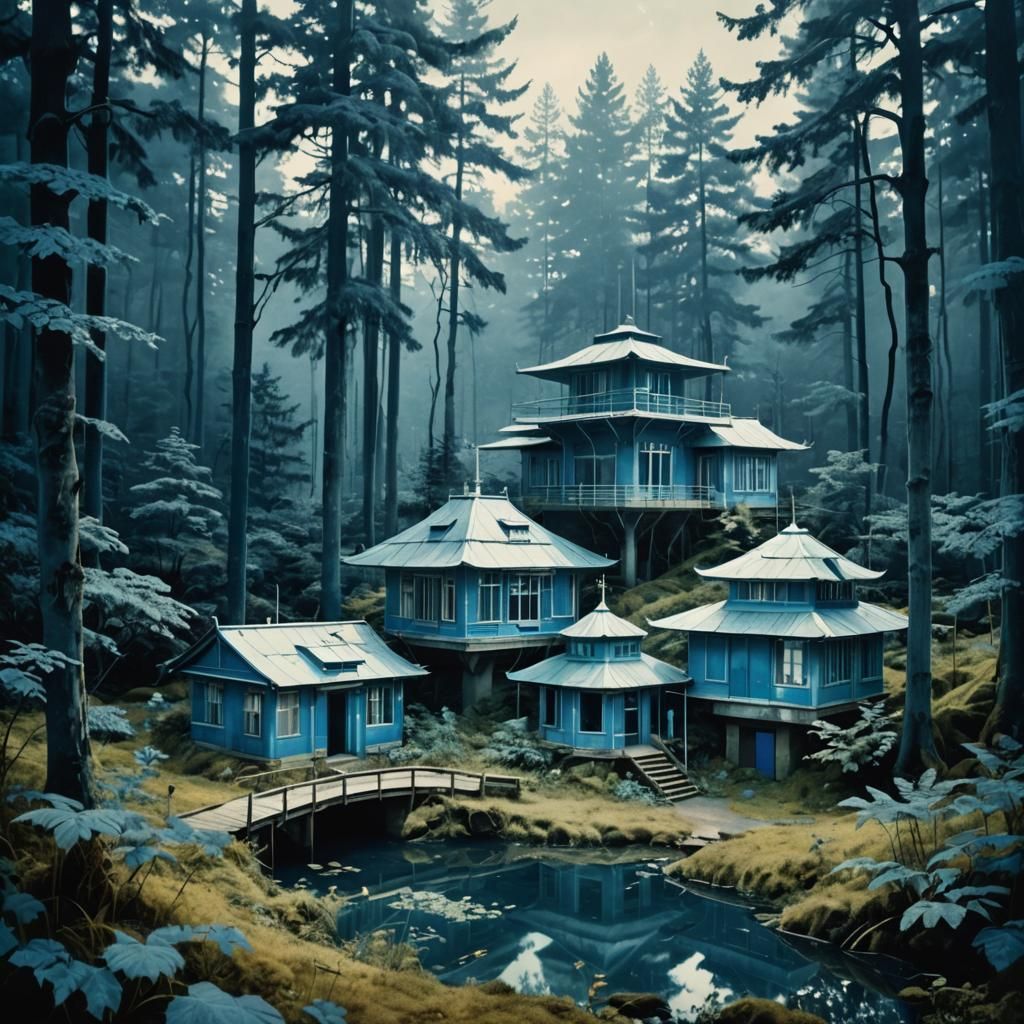 A captivating image showcasing retrofuturistic buildings nestled within a beautiful forest, rendered in a cyanotype style. The artwork evokes a dreamlike, ethereal atmosphere.