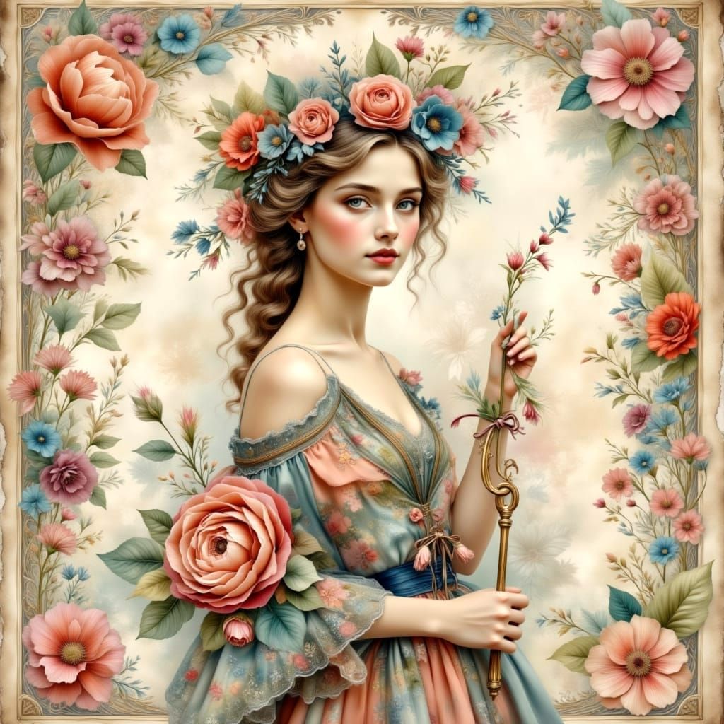 This image showcases a 1920s Paris fashion magazine cover with elegant fantasy elements. It features soft colors, intricate details, and a naive watercolor aesthetic reminiscent of vintage postcards.