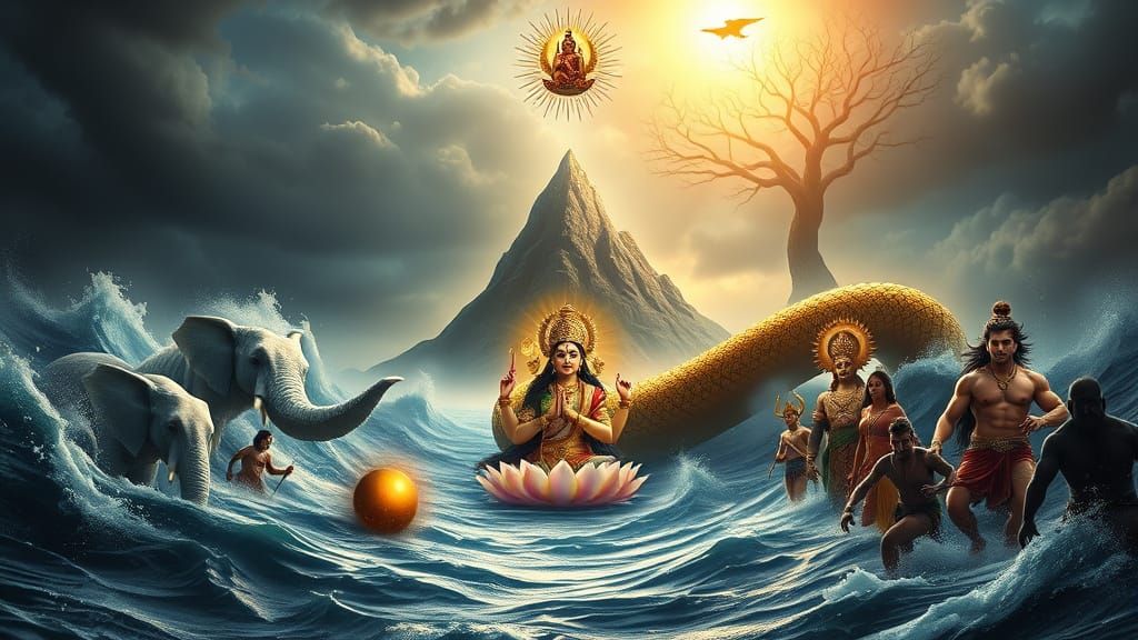 This breathtaking image captures the epic mythological scene of Samudra Manthan, where divine and dark forces engage in a cosmic tug-of-war. Mount Mandara rises from the stormy ocean, surrounded by divine beings and fierce warriors, amidst a swirling vortex of treasures and jewels. Ethereal light and rad...