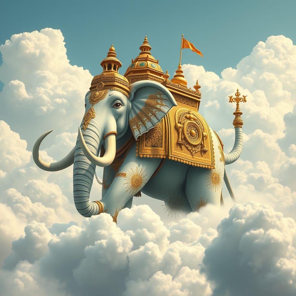 A majestic divine elephant with four tusks and seven trunks stands amidst fluffy clouds. The intricate golden ornaments and white complexion are rendered in art nouveau style.