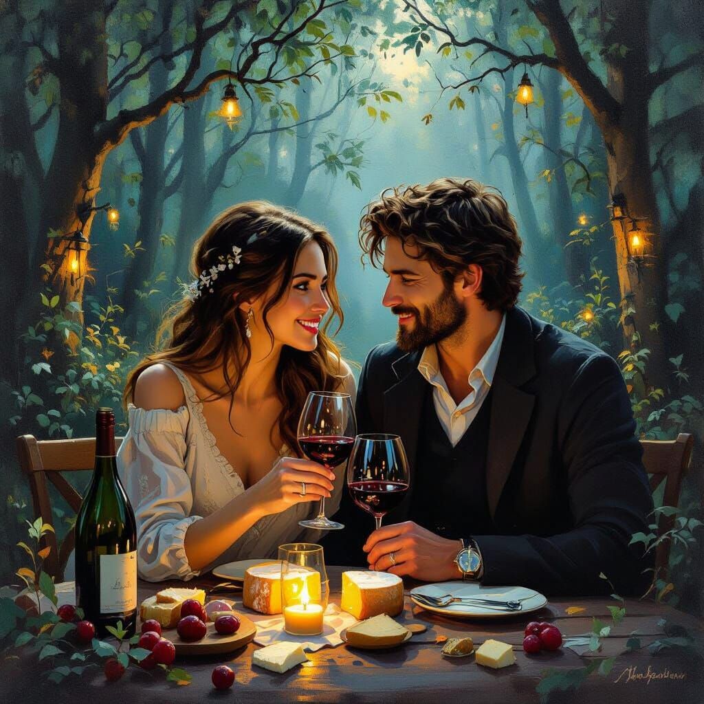 A romantic couples' evening in a whimsical forest setting. The image evokes intimacy through warm lighting and classical painting techniques, reminiscent of impressionism.
