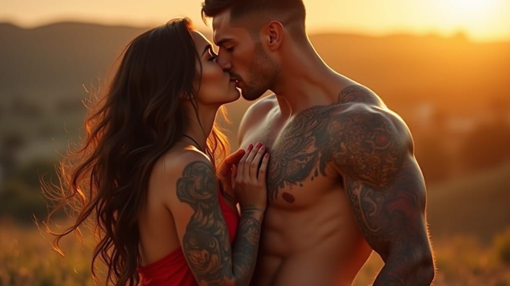 This image shows a couple sharing a passionate kiss at sunset, with the man displaying a detailed dragon tattoo. Photorealistic style with warm, volumetric lighting and cinematic film grain.