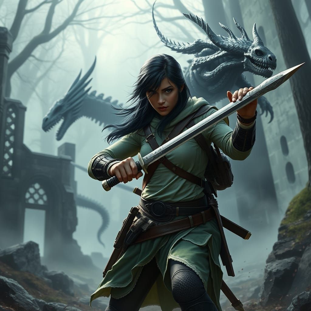 This image shows a fierce female warrior in a mystical forest, battling a skeleton dragon amidst ancient ruins and soft ethereal light, in a photorealistic high fantasy style