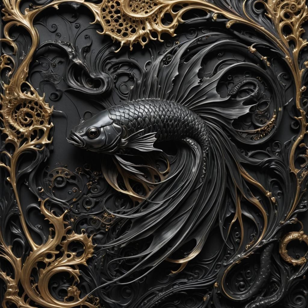 This image shows a black biomechanical dragon sculpture inspired by a Japanese fighting fish. Golden fluid flows inside the intricate design, blending organic and artificial elements in a Giger-esque style.